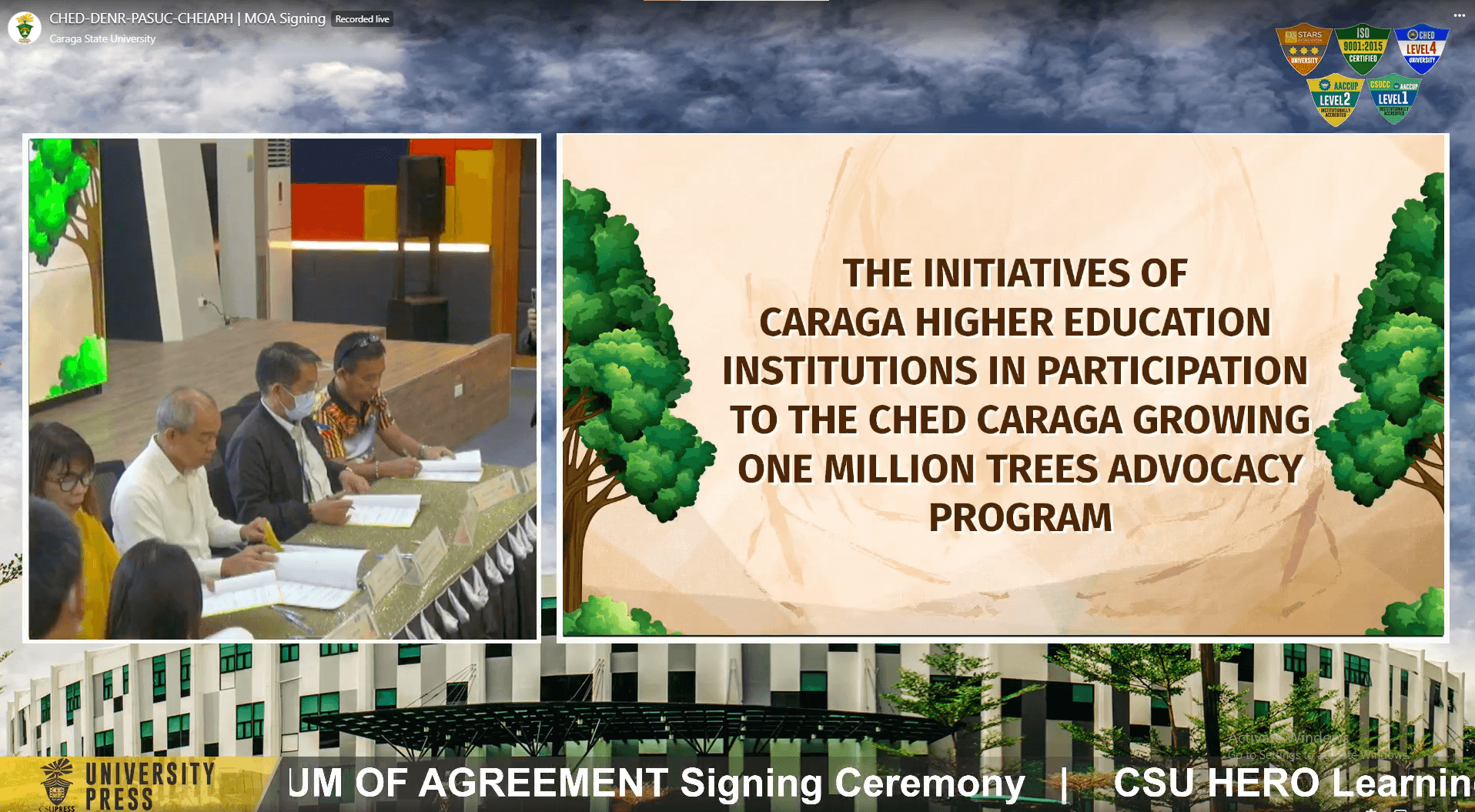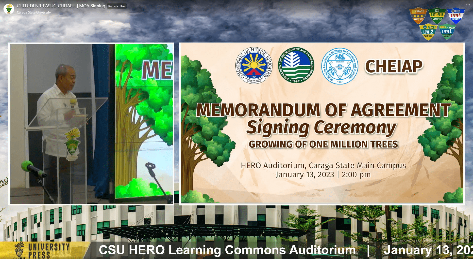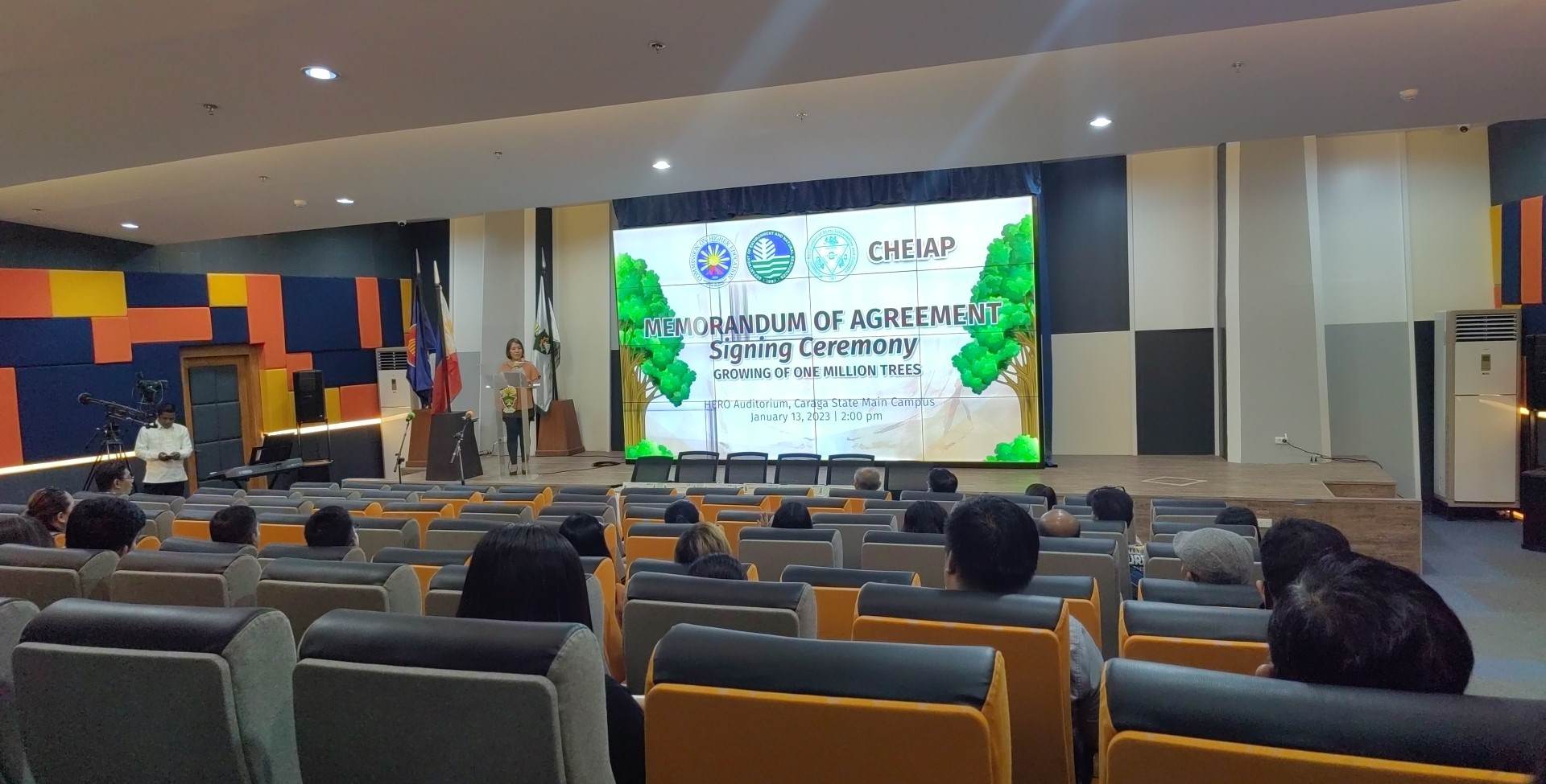 On January 13, 2023, the Commission on Higher Education – Caraga Regional Office (CHED Caraga) conducted the Ceremonial Signing of the Memorandum of Agreement between CHED Caraga, the Department of Environment and Natural Resources Caraga Regional Office (DENR Caraga), and Caraga Higher Education Institutions, to formalize commitments to the continued implementation of the Growing One Million Trees Advocacy Program, an advocacy spearheaded by CHED Caraga.