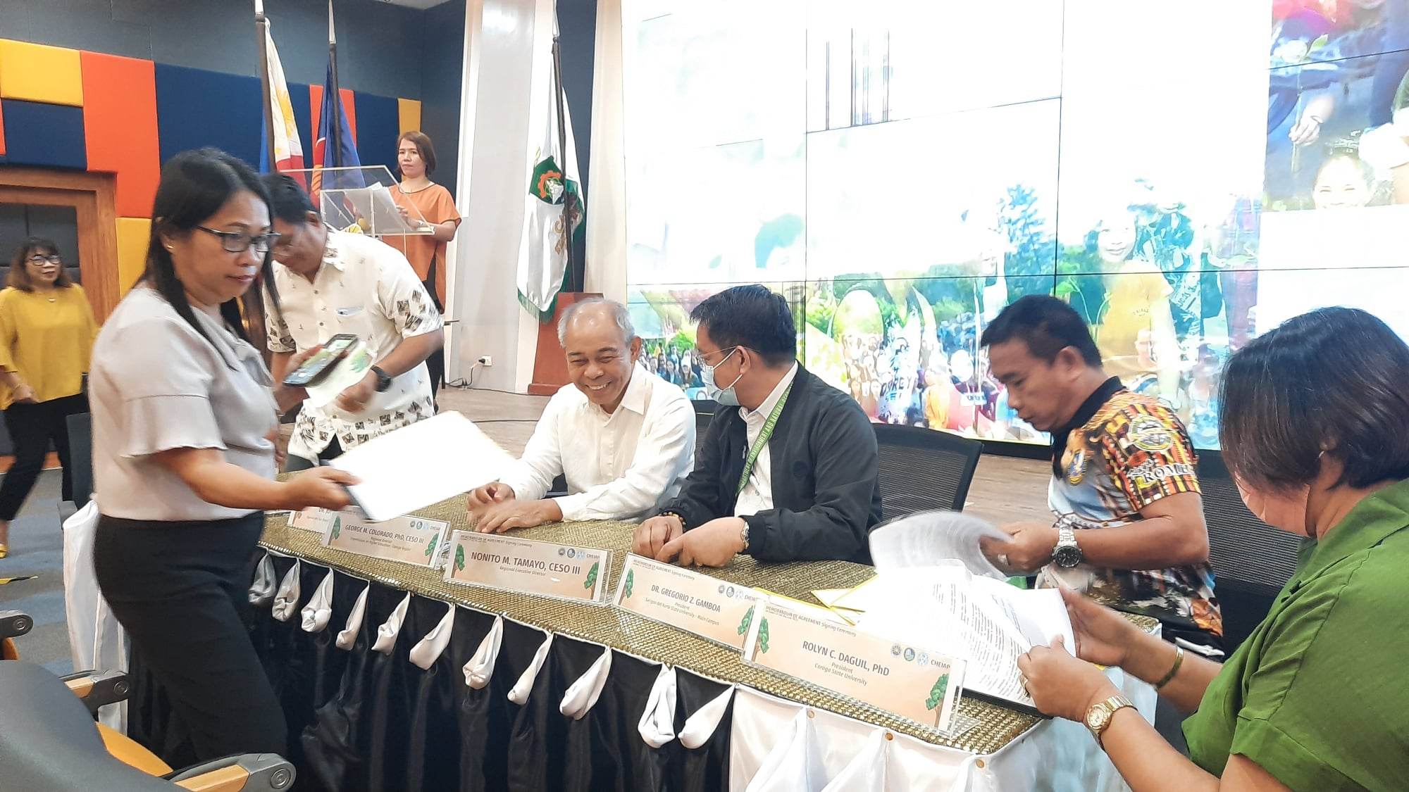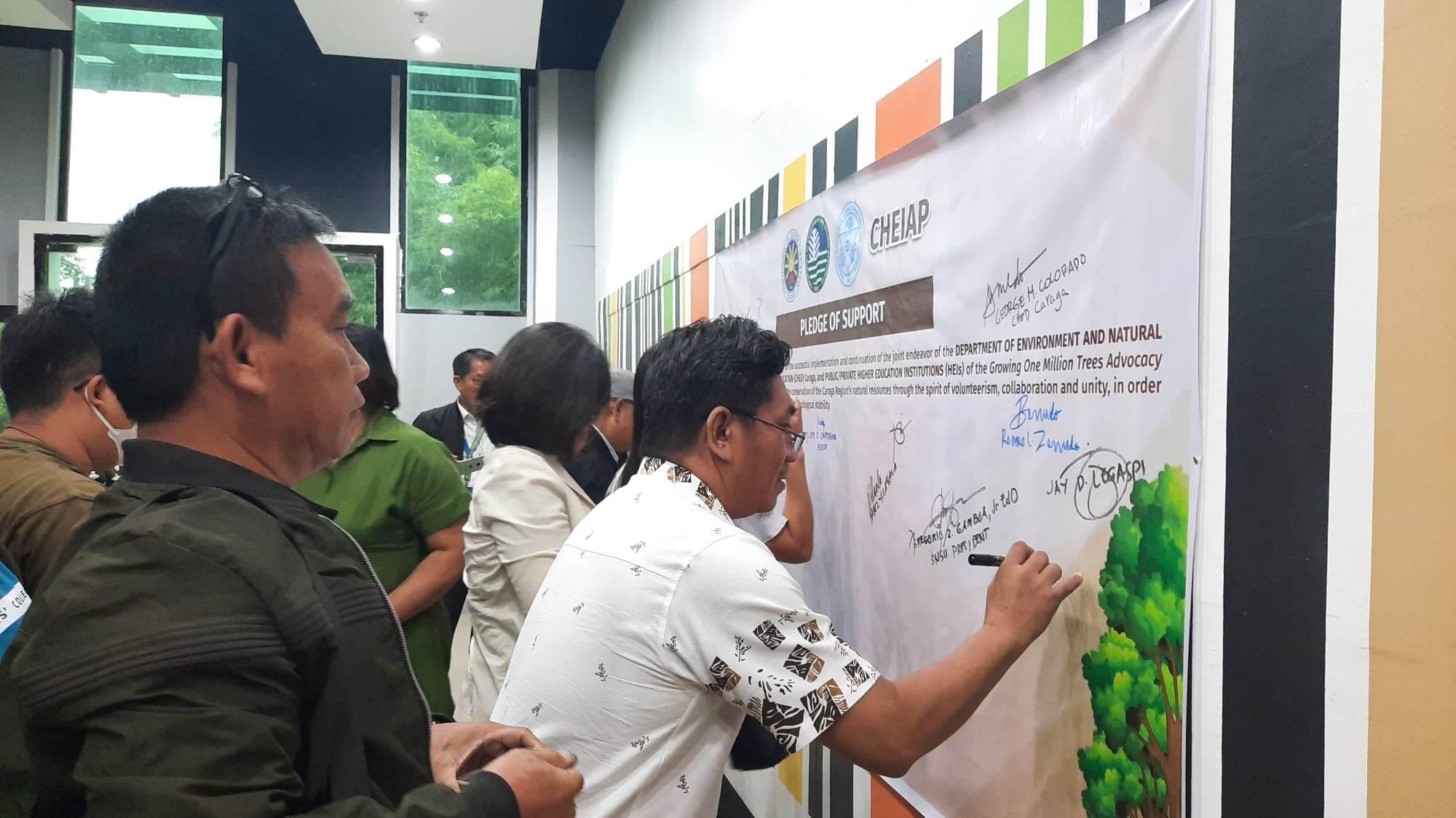 The ceremonial signing proper involved CHED Caraga Regional Director Dr. George M. Colorado, DENR Dir. Tamayo, and Caraga HEI Presidents as witnesses. After which, the attendees and signatories stood to give their pledge of voluntary commitment to the advocacy program.
