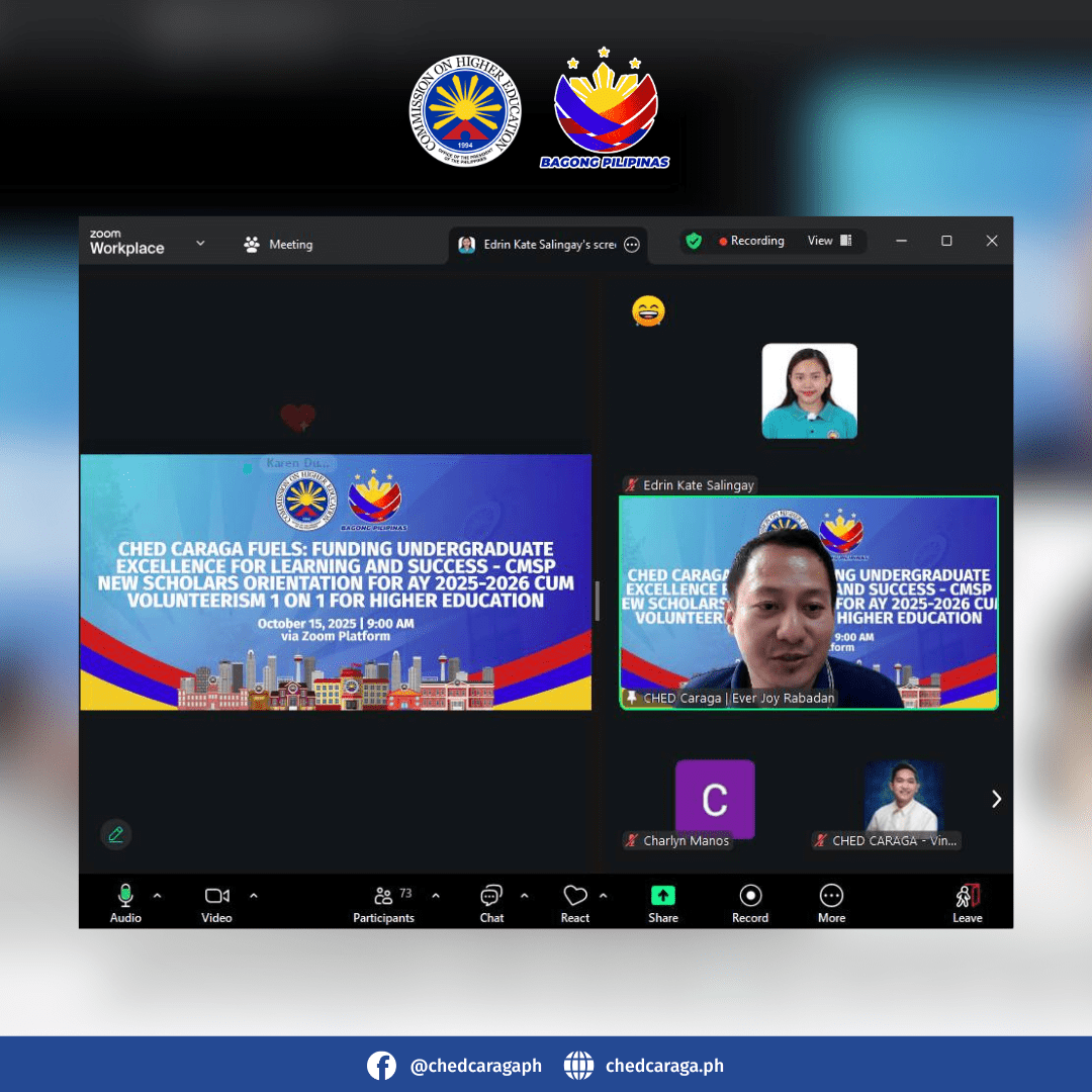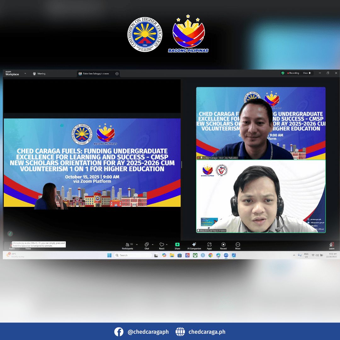 The Commission on Higher Education (CHED) Caraga successfully conducted the orientation for new scholars under CHEDβs Merit Scholarship Program (CMSP) held on October 15, 2025 via zoom.