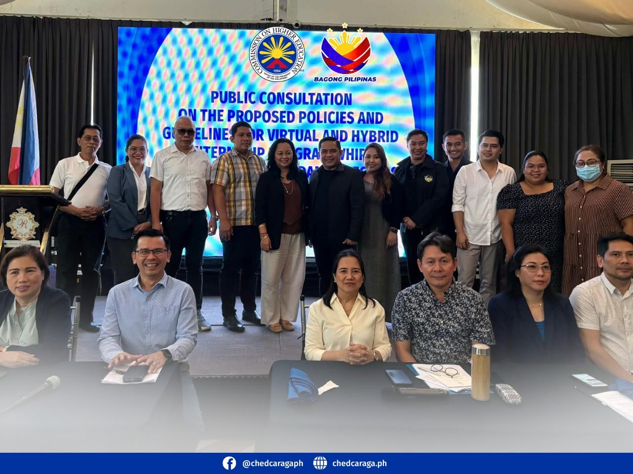 In line with its commitment to advancing student development initiatives, the Commission on Higher Education (CHED) Caraga Regional Office, represented by its Regional Director, Dr. Nelia A. Alibin, actively joined the Public Consultation on the Proposed Policies and Guidelines for the Virtual and Hybrid Internship Program (VHIP) held on, November 6, 2025, at the Grand Regal Hotel, Davao City.