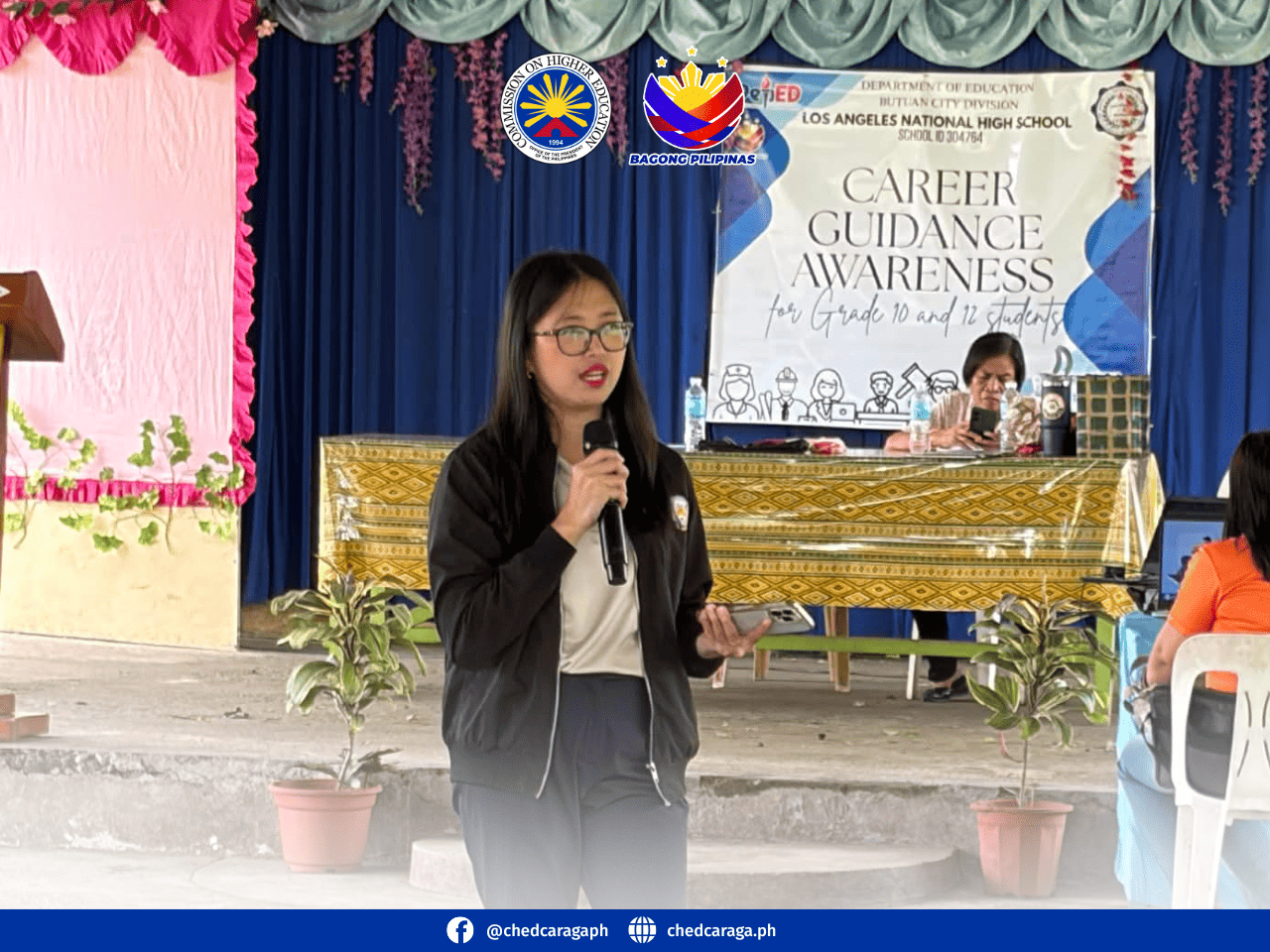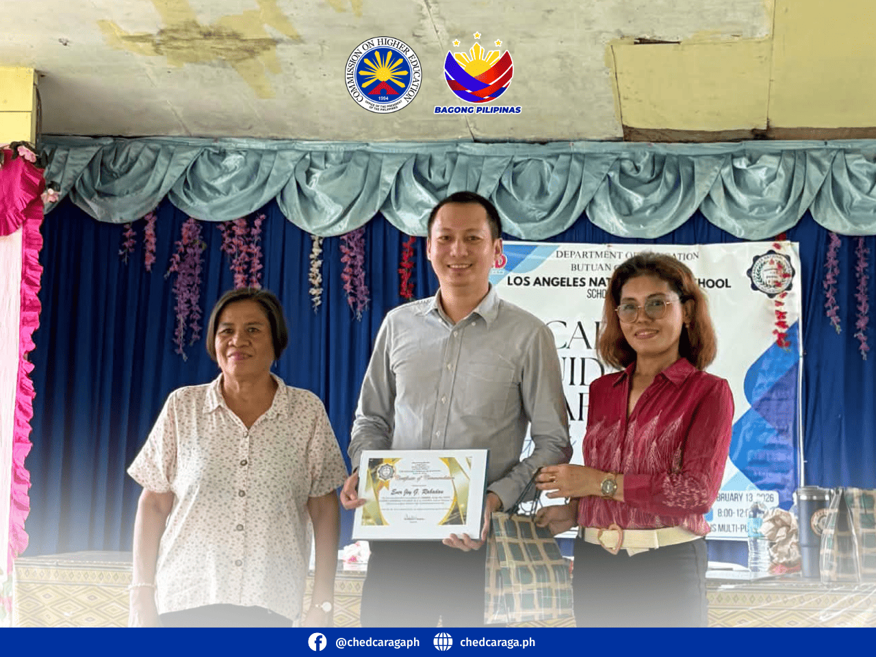 As part of its commitment to expanding access to quality higher education in the Caraga region, the Commission on Higher Education (CHED) Caraga, through Mr. Ever Joy G. Rabadan, MAEM, MSc., Education Supervisor/Scholarship Unit In-Charge, together with Ms. Heidi M. Paredero, Project Technical Staff III / Lead Regional Coordinator of UniFAST Caraga, shared career pathways and scholarship opportunities with Grade 10 and 12 students of Los Angeles National High School during the Career Guidance Awareness Program held on February 13, 2026, at the LANHS Multi-Purpose Hall.